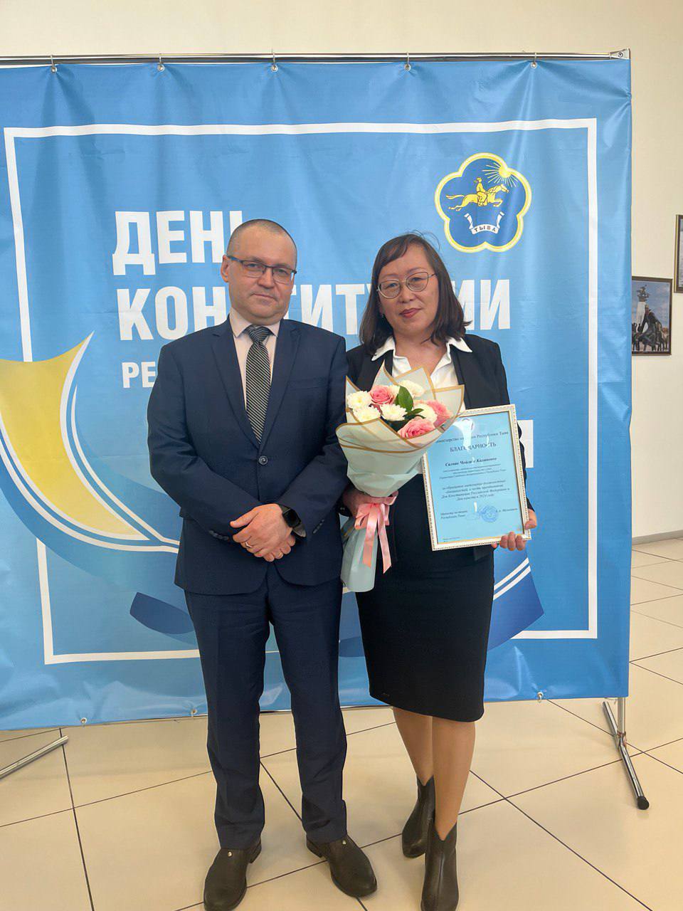 | Министерство юстиции Республики Тыва накануне празднования Дня Конституции Республики Тыва 5 мая 2025 года на торжественном собрании, посвященном празднику, провело награждение государственными и ведомственными наградами отличившихся юристов республики. Благодарностью Министерства юстиции РТ награждена консультант отдела организационно-правового обеспечения деятельности судов Управления Салчак Чойгана Калиновна. При награждении Министр юстиции мельников Е.А. отметил, что Чойгана Калиновна эффективно взаимодействует с сотрудниками аппарата судебных участков мировых судей республики, проводит обучение по программам, формирующим судебную статистику, консультирует по ведению судебного делопроизводства.